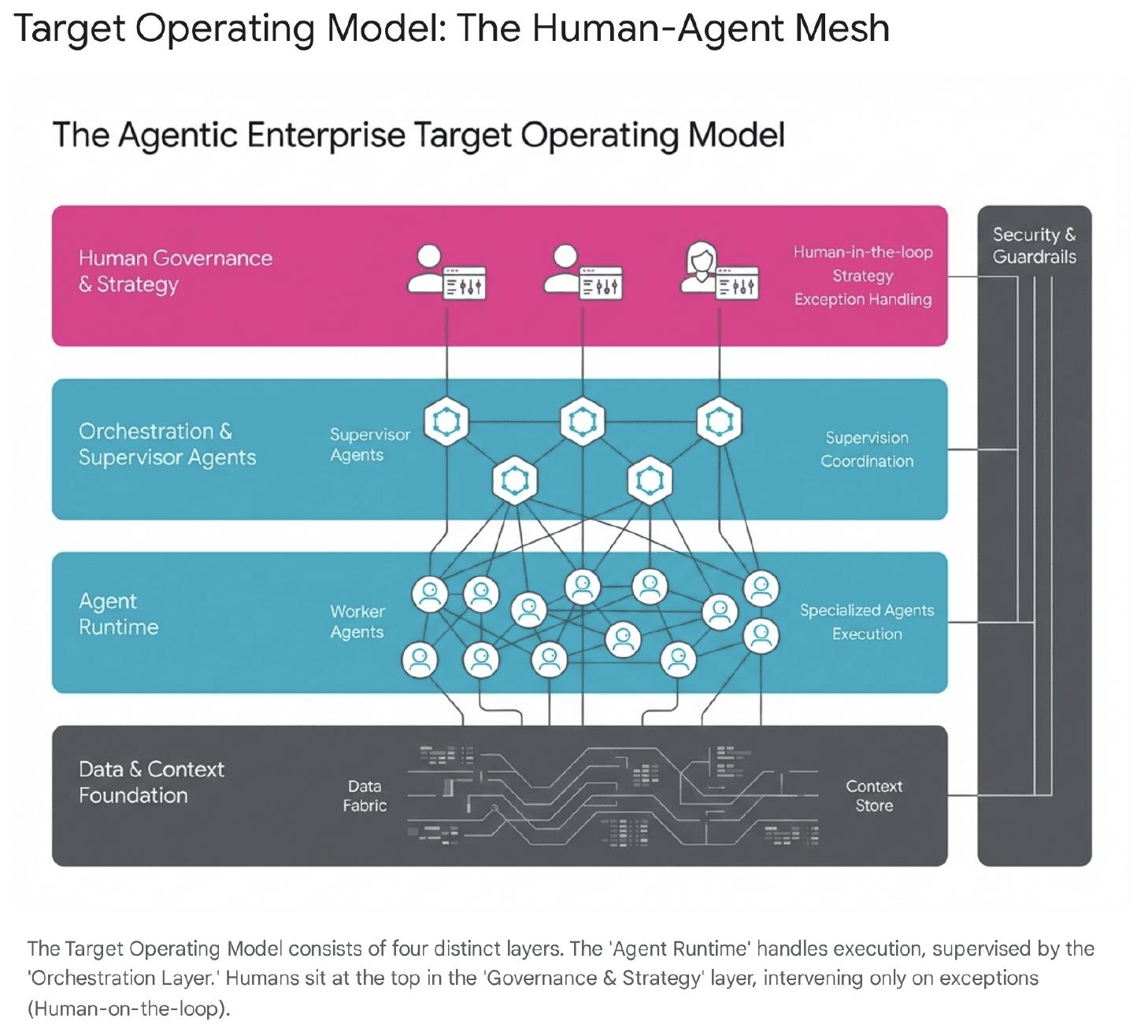 Deterministic work (execution, monitoring, reporting, standard compliance) shifts into an agentic mesh.