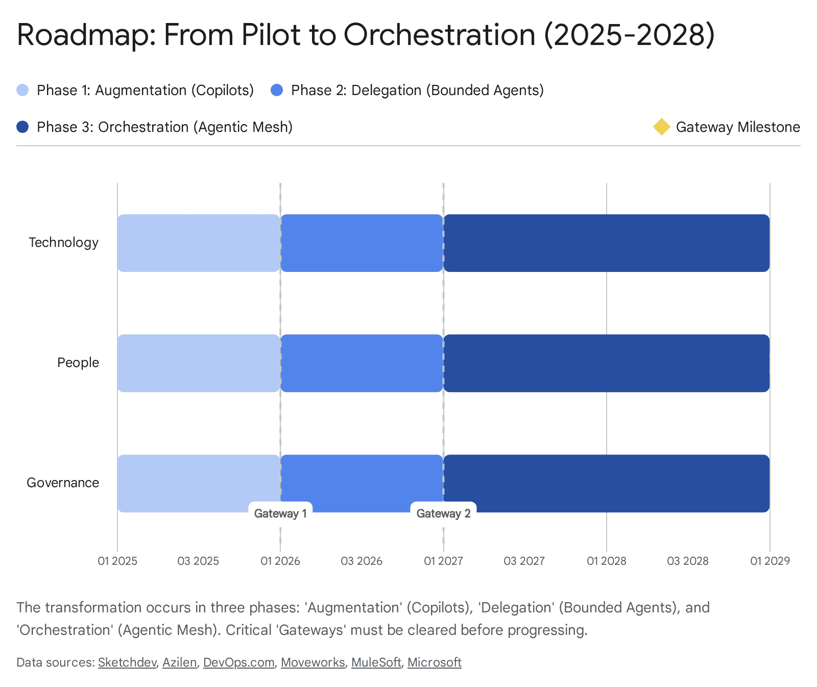 Phase 3, Mesh era: human-out-of-the-loop execution layers; key trigger is legal and regulatory clarity; key risk is institutional knowledge loss and systemic brittleness.